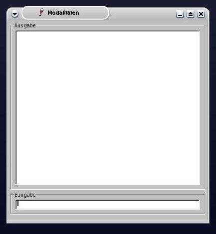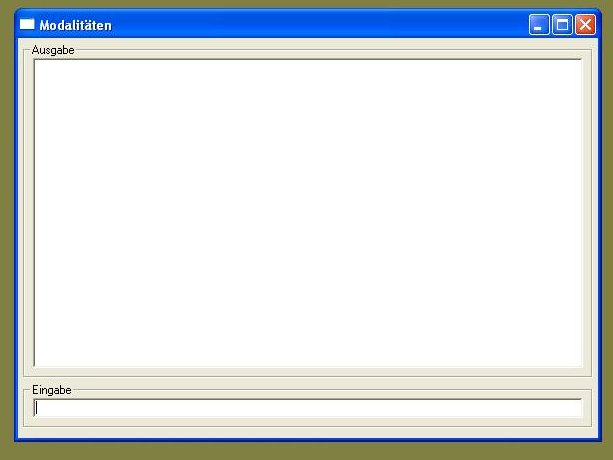Wenn das Programm gestartet wird, erscheint das Fenster, wie in den beiden Abbildungen. In Dem mit "Eingabe" deklarierten Bereich kann eingegeben werden. In Dem mit "Ausgabe" deklarierten Bereich wird ausgegeben. Der Benutzer gibt ein, das Programm gibt aus.